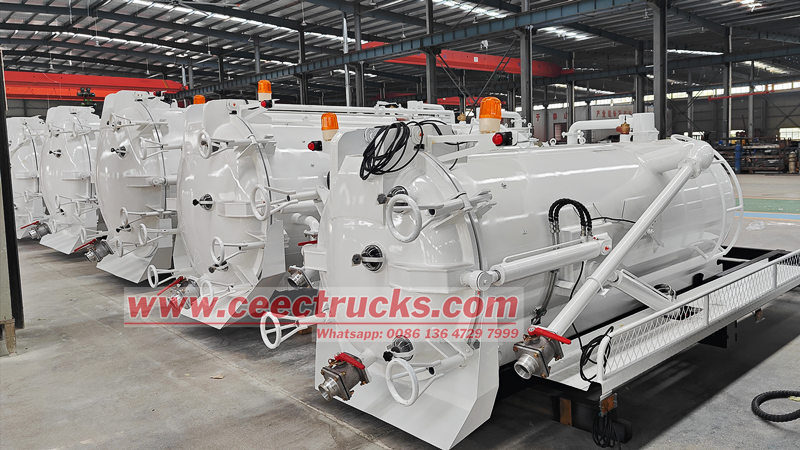 Unidad cisterna de vacío montada sobre camión de 12.000 litros (también llamada carrocería superior de camión con bomba de succión de vacío de 12 m³, superestructura de camión cisterna de vacío de 12.000 litros, kit de carrocería superior para camión con bomba de tanque séptico, carrocería superior de camión de succión de vacío, kit de camión de succión de aguas residuales de vacío de 12 m³) Montado sobre el chasis de un vehículo, absorbe y recoge líquidos como aguas residuales, lodos, sedimentos de fosas sépticas, petróleo crudo y pequeños residuos sólidos, como piedras. Se puede utilizar ampliamente para la limpieza de alcantarillas, fosas sépticas y cunetas, desempeñando un papel fundamental en el saneamiento municipal y la gestión ambiental.