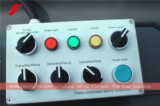 Todos los accesorios estándar: elevador del contenedor de basura, escalera, luces de advertencia, botón de parada de emergencia, pasamanos, extintor de incendios, kit de herramientas básico, manual en inglés... |