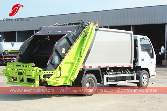 Camión compactador de basura Dubai 5cbm a la venta al mejor precio, ISUZU Chasis 4x2, equipado con motor diesel de 120HP, manual MSB de 5 turnos Caja de cambios, caja de control PLC Siemens de Alemania, dispositivo de inclinación trasera carga de contenedores de basura internacionales de 240L, 360L, 660L y 1100L, pintura y los registros dependen de los requisitos.