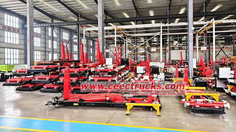 ● La estructura superior del cargador de gancho de brazo giratorio utiliza un diseño de brazo de gancho y cilindro hidráulico unidos, que acciona hidráulicamente todo el proceso de enganche, elevación, descarga y colocación del carro.
