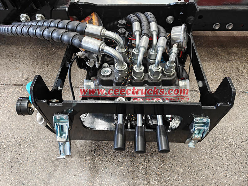 Este aceite a alta presión se suministra mediante conductos hidráulicos a los cilindros hidráulicos, impulsando la extensión, rotación y los movimientos de elevación y descenso del brazo del gancho, a la vez que controla la apertura y el cierre del mecanismo de bloqueo para enganchar, elevar y asegurar el contenedor de residuos. Todo el proceso está controlado con precisión por el sistema hidráulico, lo que garantiza un movimiento suave y continuo.