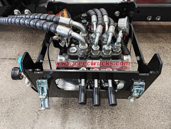 Principio de transmisión de potencia y actuación: La superestructura del cargador de gancho con brazo giratorio utiliza el motor del vehículo como fuente de energía, transmitiendo la potencia a una bomba hidráulica mediante una toma de fuerza. La bomba hidráulica convierte la energía mecánica en energía hidráulica, generando aceite a alta presión.