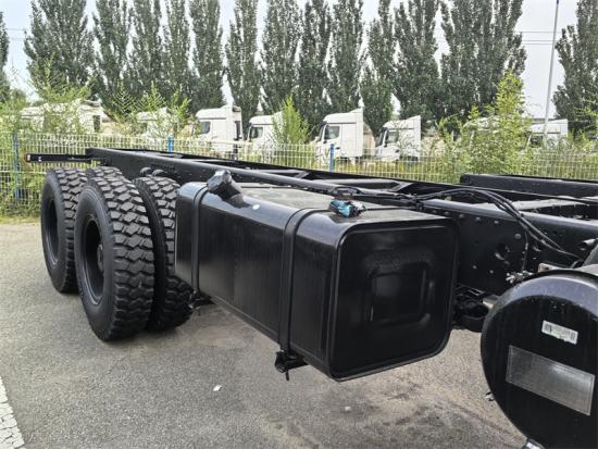 El chasis de tracción total Beiben 6x6 utiliza la cabina modelo Beiben NG80 2638AP, es de tracción total, tiene una distancia entre ejes de 4450+1450mm, está equipado con un motor Weichai WP10.380E32, una caja de cambios Fast de 9 velocidades, un eje delantero de 7 toneladas, un eje doble trasero de 18 toneladas, neumáticos 12.00R20 y una velocidad máxima de 90km/h.