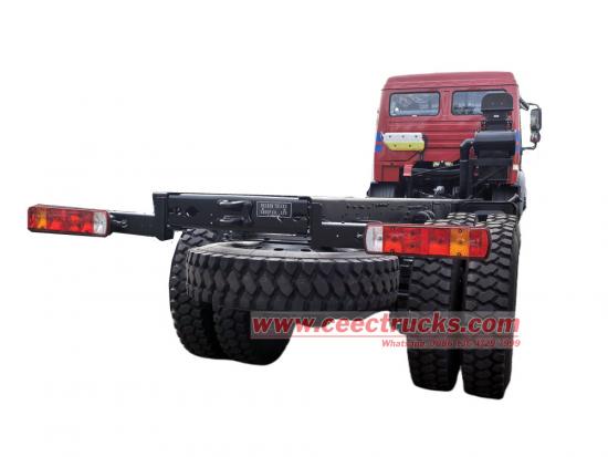 El chasis del camión de carga Beiben 6x6 con tracción integral utiliza el chasis de cabina larga Beiben NG80B 2642APZ con una distancia entre ejes de 4450+1450 mm. Está equipado con un motor Weichai WP12.420E32, una caja de cambios Fast 12JS200TA, neumáticos 12.00R24, tracción integral 6x6, dirección asistida hidráulica ZF8098, ejes con tecnología alemana Mercedes-Benz, frenos neumáticos de doble zapata de 7 toneladas en el eje motriz delantero, frenos neumáticos de doble zapata de 18 toneladas con reductores de cubo y un eje trasero motriz de doble reducción con capacidad para transportar hasta 40 toneladas.
