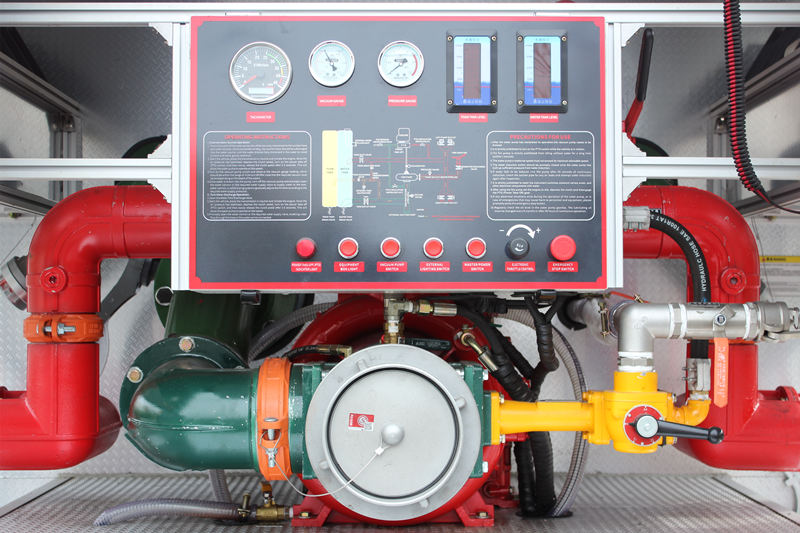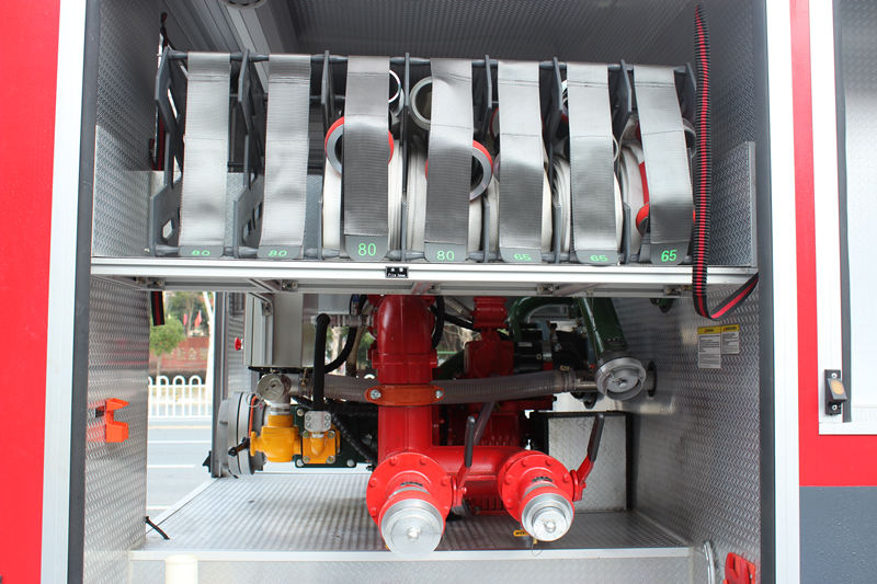 â–² Sistema de bomba contra incendios:El vehículo está equipado con una bomba contra incendios CB10/60 de alto rendimiento.Con un caudal nominal de hasta 60 L/s y una presión máxima de trabajo de 1232 MPa, garantiza el suministro de agua a largas distancias y grandes caudales. La bomba de agua adopta un diseño centrífugo de dos etapas, con una potente capacidad de autocebado y un funcionamiento estable. Establece rápidamente una presión de agua estable incluso a una profundidad de succión de 7 metros.