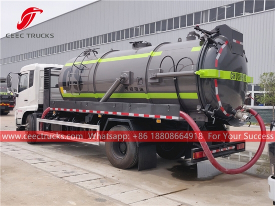 Camión cisterna de vacío Dongfeng de 12.000 litros a la venta, Dongfeng 4x2 con volante a la izquierda chasis, caja de cambios manual de 8 cambios, motor diesel CUMMINS 180HP, fuerte Cisterna de succión, bomba de vacío de marca famosa, toda la pintura y logotipos dependen según requerimiento.
