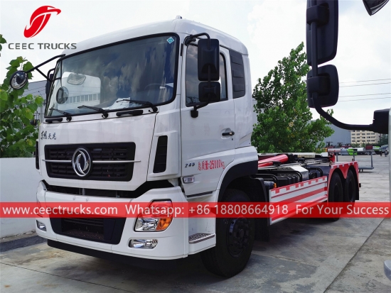 Camión de basura con cargador de gancho Dongfeng de 20 toneladas, chasis Dongfeng 6x4 con 270HP Motor diésel, caja de cambios manual de 8 cambios, cargador de gancho de alta resistencia. Sistema, con todo tipo de contenedor de basura opcional. toda la pintura y Los logotipos dependen del requisito.
