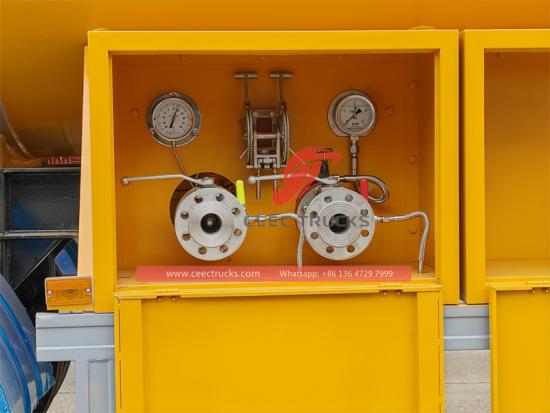 3 ejes con puente BPW (13T), 12R22.5 12PR (13 uds.), pivote de dirección JOST, pata JOST (25T), medidores de nivel de líquido mecánicos, medidor de presión doble, termómetro doble, válvula de corte de emergencia doble, cuatro válvulas de bola, válvula de seguridad doble, dos cajas de herramientas, salida única, sistema doble de carga y descarga, protección solar de aluminio, 2 juegos de extintores de incendios de 9 kg tipo ABC, 1 juego de extintor de incendios de 2 kg tipo CO2, 3 juegos de placas de señalización de peligro, 2 juegos de placas numeradas naranjas, medidor de flujo con impresora |