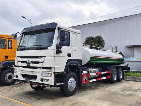 HOWO HW76, NX cabin is optionalEl camión cisterna HOWO 6x4 es un vehículo de saneamiento ecológico multifuncional, modificado sobre el chasis SINOTRUK HOWO ZZ1257 6x4. Está equipado con un depósito de agua de acero al carbono de 20.000 litros, una bomba de agua tipo 80QZ60/90 y un sistema de aspersión. El vehículo funciona mediante su bomba integrada, que se autoceba con agua de fuentes externas y la transporta a presión a los aspersores delanteros, traseros y laterales, así como a un cañón de agua con un alcance de ≥35 metros, lo que permite diversos modos de pulverización.