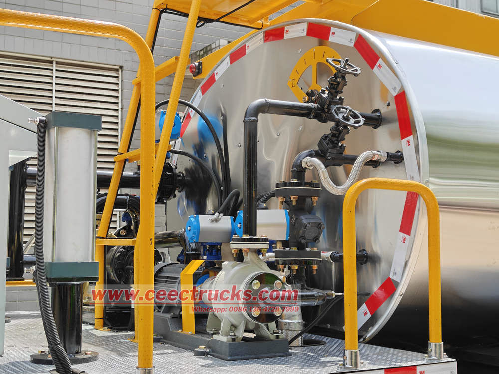 Durante su funcionamiento, la bomba de asfalto transporta el asfalto del tanque al sistema de calefacción y utiliza un quemador de combustible o aceite térmico para calentarlo hasta que fluya. El asfalto calentado se transporta al esparcidor a través de una tubería y, mediante tecnología de pulverización, se pulveriza uniformemente sobre la superficie de la carretera a través de la boquilla.