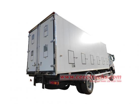 El camión frigorífico Howo 4x2 utiliza el nuevo chasis de cabina delantera Howo HW76, con una distancia entre ejes de 4600 mm. Está equipado con un motor Weichai WP10.340E22 de 340 CV y una transmisión Sinotruk HW19710 de 10 velocidades. La carrocería refrigerada mide 6500 × 2350 × 2500 mm, construido en fibra de vidrio con FRP + espuma de PU + panel de FRP de 105 mm, con panel sándwich completamente cerrado, puerta de apertura a la derecha, puertas traseras dobles de tamaño completo y suelo antideslizante y resistente al desgaste. Utiliza una unidad de refrigeración no independiente CARRIER CITIMAX 1100.