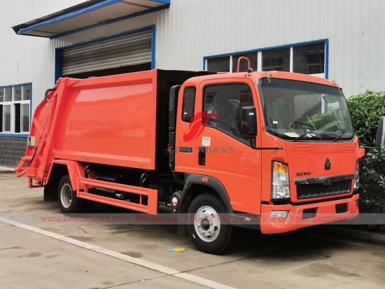 Camión compactador de basura HOWO RHD 8cbm, el chasis del camión utiliza un motor diésel YUCHAI 160HP, transmisión manual de 6 cambios. Caja de control CAN-BUS para fácil operación. Toda la pintura y logotipos. Según los requisitos del cliente.