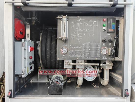 Left side view of the independ room, which have integrated control panel, language can be English, French, Russia, Arabic, etc. Matched working with independent control valves and flow meter. The hose reel matched with refueling gun for multiple usage.