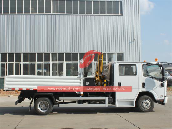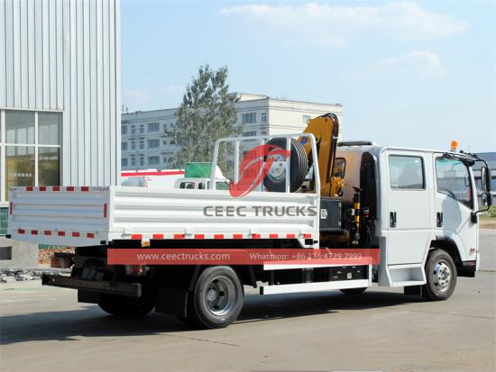Equipped with XCMG loader craneEl Grúa montada en camión de carga Isuzu ELF de 190 HP Es un camión potente y bien diseñado con ventajas absolutas en operaciones de transporte y elevación. El camión grúa Isuzu está equipado con un motor diésel de la marca ISUZU con una potente potencia de 190 HP, que puede satisfacer las necesidades de trabajo rápido. La cabina de doble fila tiene capacidad para 5 personas y está equipada con aire acondicionado, lo que proporciona un entorno de conducción cómodo para el conductor y el personal. La parte superior del camión grúa de doble cabina Isuzu NPR está equipada con una grúa de brazo plegable con una capacidad máxima de elevación de 5 toneladas, una altura máxima de elevación de 11 m y una rotación completa de 520°. La grúa pesa 950 kg y tiene un espacio de instalación de 850 mm. Al mismo tiempo, la caja tiene función de autodescarga y el panel de control puede elegirse entre inglés y otros idiomas, lo cual es conveniente para usuarios con diferentes necesidades. El camión grúa de carga Isuzu NPR también ofrece una variedad de configuraciones opcionales, como pluma telescópica, pluma de cuchara, caja de carga de lona, grosor y altura de caja personalizados según las necesidades, y caja de control de operación remota.