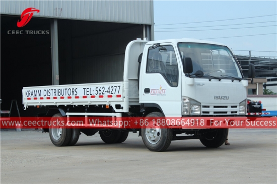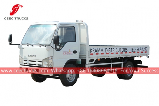 Camión de carrocería plana ISUZU, chasis ISUZU ELF 4x2, MSB de 5 turnos caja de cambios manual, motor diesel ISUZU 98HP, pintura y logotipos dependen según requerimiento.