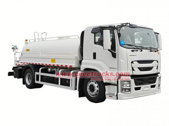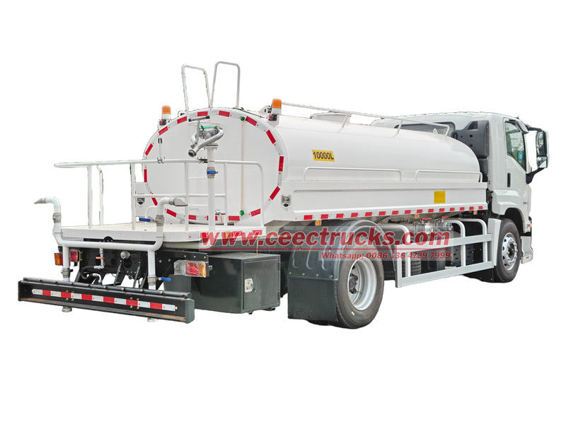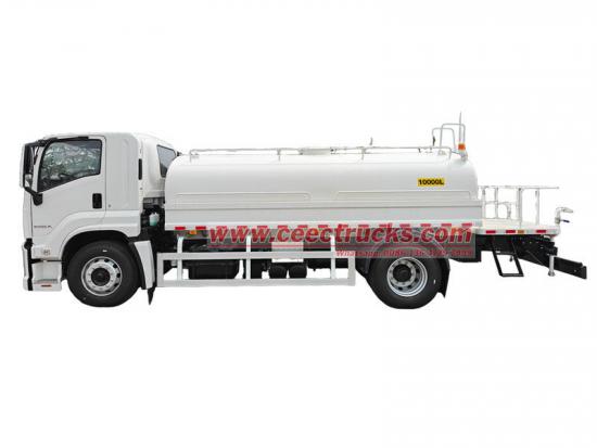 Camión cisterna de agua potable Isuzu FTR modificado sobre el chasis Isuzu FTR GIGA, motor 4HK1-TC60, 4 cilindros en línea, potencia máxima de 151 kW (205 hp), caja de cambios Isuzu MLD de 6 velocidades, la parte superior es un tanque de agua de acero al carbono de 10 cbm, está configurado con descarga frontal, rociador trasero y rociador lateral, una bomba de agua especial autocebante que puede bombear y drenar agua, con una junta contra incendios, una válvula de gravedad, una plataforma de trabajo en la parte trasera del tanque y un cañón rociador de ecologización instalado. El cañón puede girar y ajustar el volumen de agua (rociado en forma de columna, niebla, llovizna).