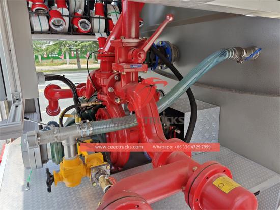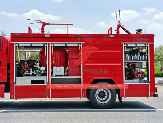 Customized dry chemical system with Nitrogen tankerEste camión de bomberos de pólvora seca está construido sobre el chasis ISUZU NEW GIGA FTR. Está equipado con un potente motor ISUZU 4HK1-TC. GRAMO 60 con una cilindrada de 5,19 L y una potencia de salida de 205 caballos de fuerza. Adopta un modo de conducción 4X2 y está equipado con una caja de cambios MLD-6 velocidad. La velocidad máxima puede alcanzar los 95 km/h, que se adapta a diversas condiciones complejas de la carretera. En cuanto al sistema de extinción de incendios, el camión de bomberos Isuzu está equipado con un tanque de almacenamiento de polvo seco de acero al carbono de 1000 kg, además de un tanque de agua de 3000 L y un tanque de espuma de 2000 L. Cuatro cilindros de nitrógeno de 80 litros con una presión de diseño de 15 MPa asisten al sistema de extinción de incendios de polvo seco. La bomba contra incendios es impulsada por PTO, con un rango de presión de 1,6-2,5 MPa y un caudal de 80-120 kg/s. El cañón de fuego tiene una velocidad de pulverización de 60-100 kg/s y un alcance de 40-60 metros, que puede lidiar eficazmente con diversas situaciones de incendio. El camión de bomberos Isuzu GIGA también está equipado con un conjunto completo de equipos estándar de extinción de incendios y rescate, como palas, palancas, hachas y equipos de corte, con escaleras y focos opcionales.