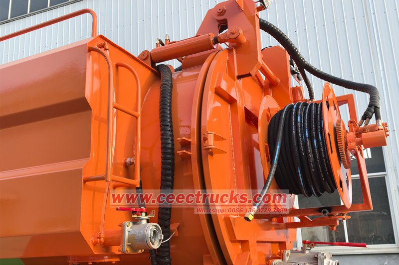 El vehículo está equipado con una bomba de agua de alta presión que presuriza el agua limpia a 16-240 MPa y, mediante una boquilla giratoria, elimina las obstrucciones persistentes, como sedimentos, raíces de árboles y bloques de hormigón, en la pared interior de la tubería. Al mismo tiempo, una bomba de vacío genera una presión negativa en el cuerpo del tanque para succionar los lodos triturados y las aguas residuales a través de la tubería de succión. El cabrestante hidráulico controla la extensión y contracción de la tubería de alta presión durante toda la operación, garantizando así que el operador pueda completar el dragado profundo de la tubería sin necesidad de excavar en el pozo.
