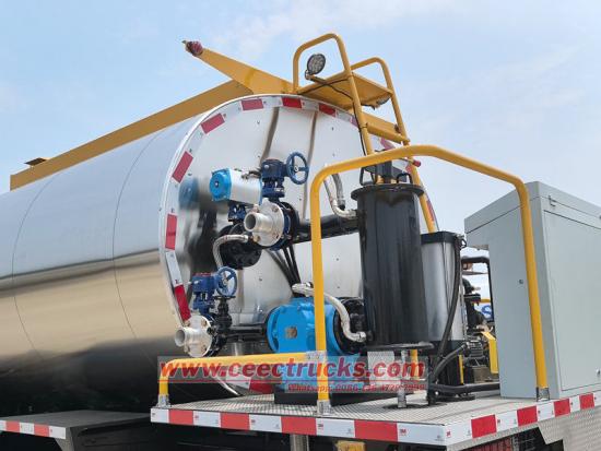Su carrocería está equipada con un tanque de aislamiento de gran capacidad, que utiliza materiales aislantes de alta eficiencia y un sistema inteligente de control de temperatura. Puede almacenar asfalto caliente o asfalto modificado de diferentes grados durante un largo periodo de tiempo, garantizando una temperatura estable del material y una buena fluidez.